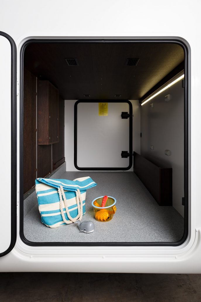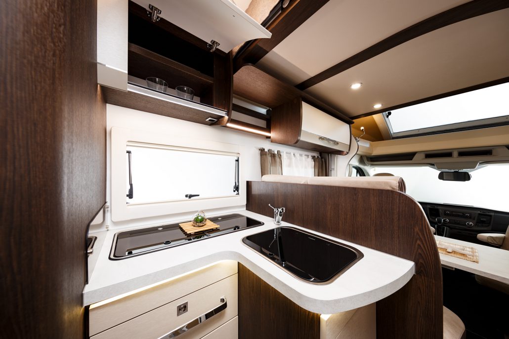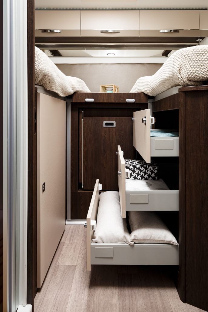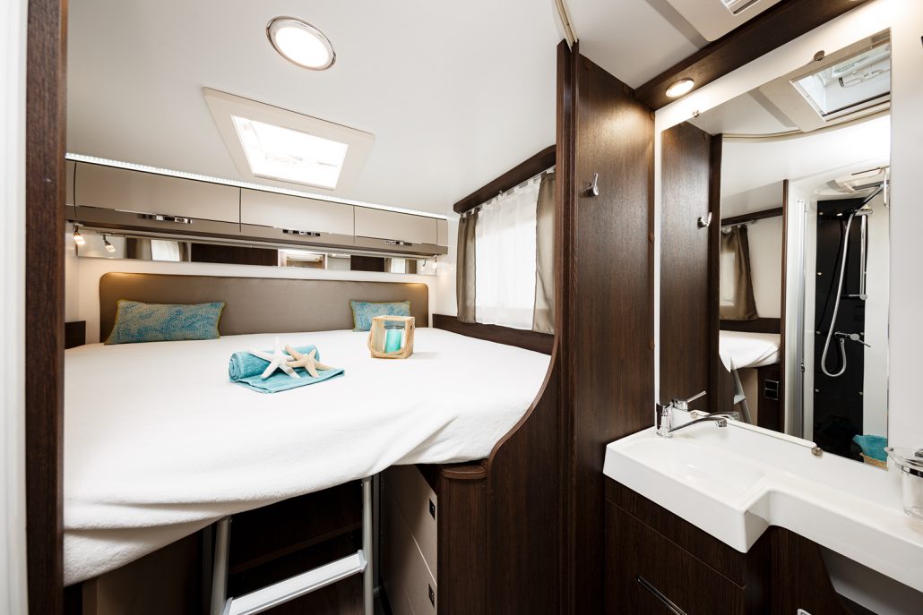 El habitáculo central cuenta con salón convertible en cama, cama doble eléctrica abatible en techo, toldo exterior de 3 m y amplio garaje lateral, todo en 7,48 m de longitud, ofreciendo comodidad y espacio para todos.