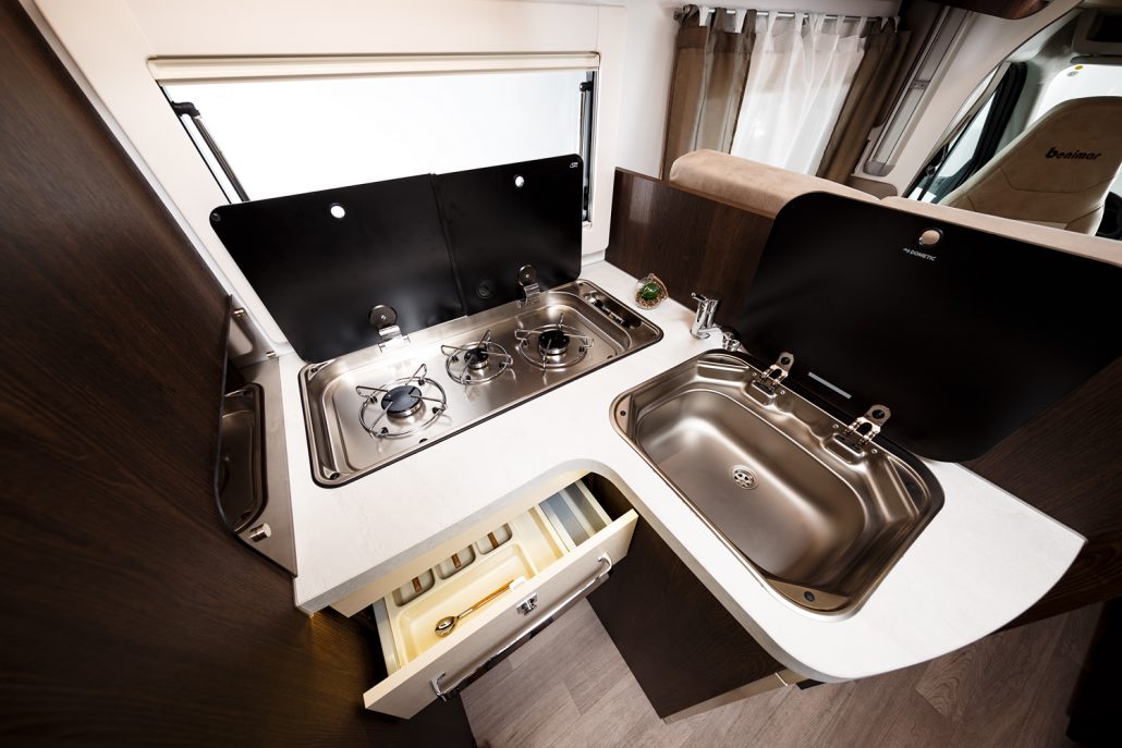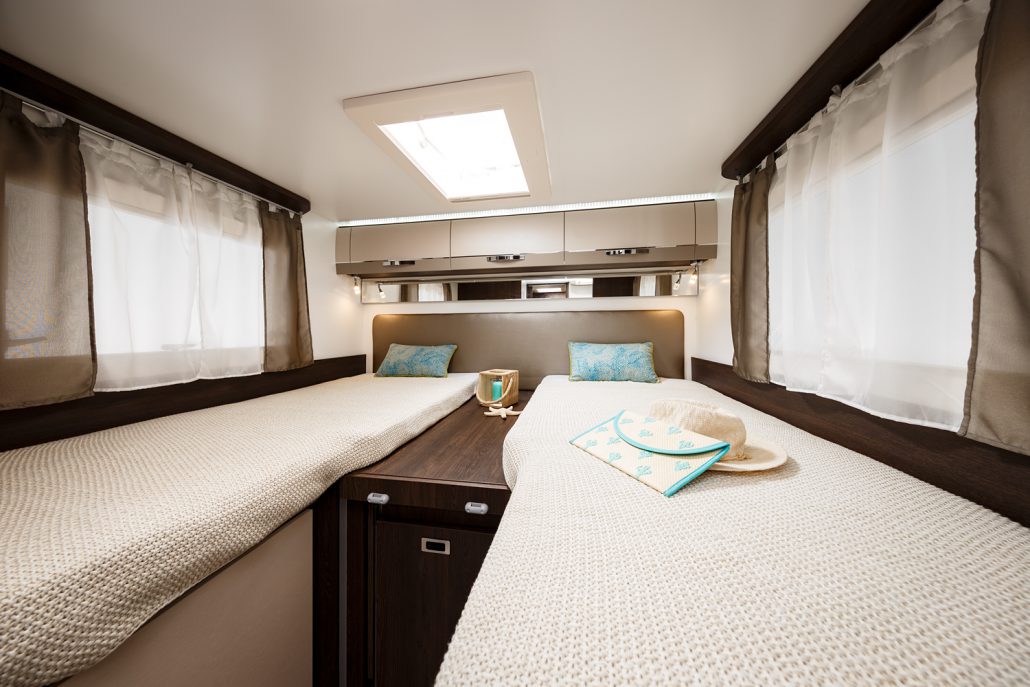 Dispone de dormitorio independiente trasero con dos camas individuales que se transforman en cama doble y baño con ducha separada. La cocina en L incluye 3 fogones, fregadero y frigorífico con congelador.